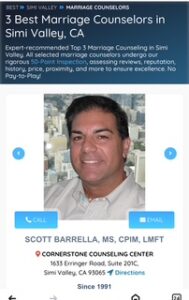 Our Clinical Director/Owner and Master Therapist at Cornerstone Counseling Center is Mr. Scott Barrella, MS LMFT CPIM. Mr. Barrella was selected as TOP THREE Therapists in Ventura County (click here for details) . He has been a recognized expert in both Family and Criminal Law case treatment since 1997. He is a sought-after commentator on critical subjects like Domestic Abuse and High Conflict Divorces by California Judges and Law Enforcement agencies. Mr. Barrella is a licensed therapist (LMFT) in California since 1995 and he personally has treated over 6000 clients. He founded Cornerstone Counseling Center in 1997 and continues to lead the center. The Cornerstone team has been an approved provider with Los Angeles and Ventura County Probation Departments for over 27 years. Experience counts when choosing a professional therapist, Class Trainer, Expert Witness and Coach for Life! We have great professionals and staff to assist you! Scott has authored Five evidence-based tool books for therapy and class usage. Mr. Barrella has worked with several high profile case, former PRO NFL, MLS and Baseball Athletes, and appeared as a guest on the Oprah Winfrey Shows, Dr. Phil Shows, Kim Pagano Shows and various other media. Please send us a message with our link below or call 805-390-6384 to begin a class or start a therapy or coaching session! Thank you!